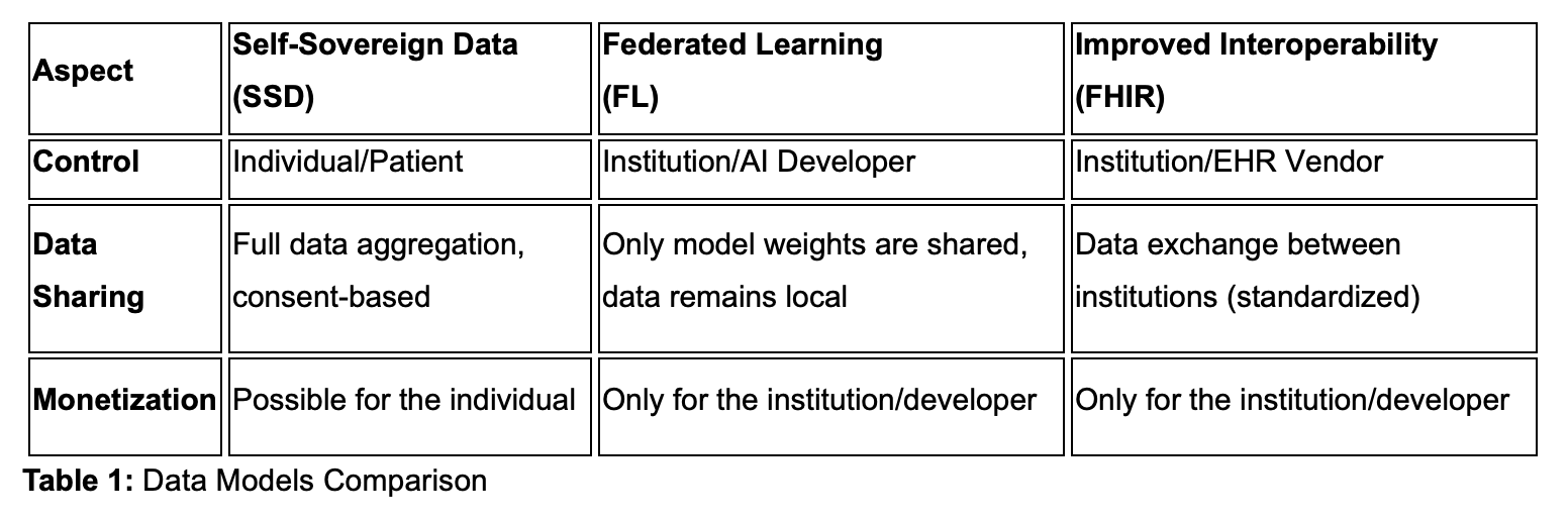 Self-governance models provide secure personal health data containers compliant with GDPR, HIPAA, and FHIR. AI powers functions like tokenization and data revocation, enabling selective sharing while preserving privacy (Rosenstrauch et al., 2023). Modeled outcomes suggest this real-time access could significantly enhance clinical decision-making, potentially lowering diagnostic errors by 10-15%. Realizing these benefits requires addressing key implementation challenges. Active heath data management by consumers is central to SSD, which introduces the risk of a Digital Divide and User Fatigue among less digitally adept populations, potentially creating an equity gap. Furthermore, the model faces an Implementation Risk known as the "Walled Garden" problem: if major EHR systems do not fully integrate SSD frameworks, new data silos might form. To protect users, robust governance frameworks are necessary to mitigate the risk of financial coercion associated with Ethical Monetization of sensitive data. Finally, the system design must ensure data resilience and secure emergency access protocols to prevent loss of control if an individual misplaces their primary access key.
